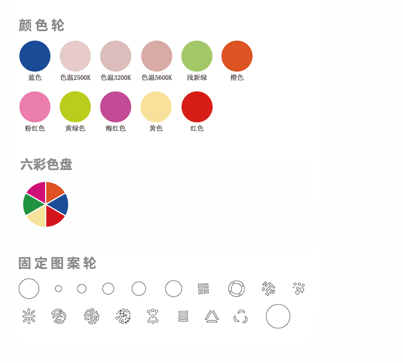 1個固定圖案盤,12種圖案及7種白圓效果,
